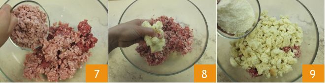 Maintenant, consacrez-vous à la préparation du pain de viande : dans un grand bol, mélangez le bœuf, les dés de pancetta, la mortadelle 7, les morceaux de mie de pain 8, le pecorino râpé 9,