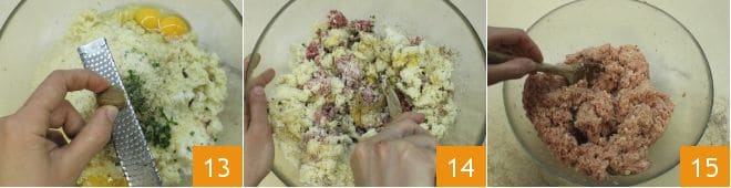 une pincée de noix de muscade râpée 13, du sel et du poivre. Mélangez la préparation avec une cuillère en bois pour intégrer les ingrédients 14 jusqu'à obtenir une pâte homogène et bien compacte 15.