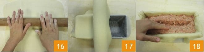 Maintenant, prenez la pâte brisée, étalez-la en une fine feuille rectangulaire 16. Beurrez le moule, tapissez-le de papier sulfurisé en laissant des rabats latéraux pour mieux retirer le pain de viande du moule et tapissez l'intérieur avec la pâte brisée, aidez-vous du rouleau à pâtisserie pour déposer la feuille 17 et placez à l'intérieur le pain de viande, créez un creux central dans le sens de la longueur 18
