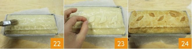 découpez l'excédent de pâte et pincez les bords pour bien souder la pâte. Battez l'œuf avec une cuillère de lait et badigeonnez le pain de viande pour que la pâte soit dorée et croustillante 22. Avec le surplus de pâte, vous pouvez créer des feuilles à appliquer sur la surface 23. Procédez maintenant à la cuisson : faites cuire dans un four statique préchauffé à 160° pendant 60 minutes. Une fois la cuisson terminée, sortez le pain de viande en croûte du four, laissez-le tiédir 24 puis démoulez-le en le soulevant avec les bords du papier sulfurisé. Servez le pain de viande en tranches et accompagnez-le de légumes variés ou de pommes de terre rôties.