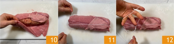 Placez au centre des tranches la préparation du pain de viande façonnée en cylindre et enveloppez-la avec les tranches de viande 10. Vous obtiendrez ainsi un pain de viande recouvert d'environ 22-23 cm. Ficellez-le avec de la ficelle de cuisine, puis attachez une des deux extrémités avec un nœud 11 et, au fur et à mesure, créez des boucles avec la ficelle autour de la main et faites passer le pain de viande à l'intérieur 12. Si vous n'êtes pas habitué, suivez notre fiche Comment ficeler le rôti.