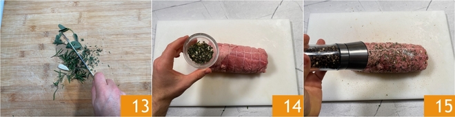 Hachez l'ail, le romarin, la sauge et le thym 13 et répartissez-les sur toute la surface du pain de viande 14 avec du sel et du poivre ; massez bien la viande 15.