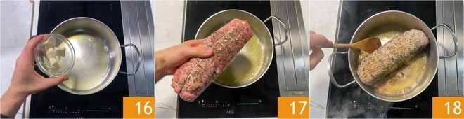 Faites fondre le beurre dans l'huile dans une grande casserole 16 et quand il sera fondu, placez-y le pain de viande 17. Faites-le revenir, en le scellant bien sur tous les côtés à feu moyen-vif 18.