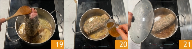 Aidez-vous de deux cuillères en bois pour le tourner et scellez aussi les extrémités 19. Mouillez avec le bouillon chaud 20, couvrez et faites cuire à feu moyen-doux pendant une heure en le retournant toutes les 20 minutes 21.