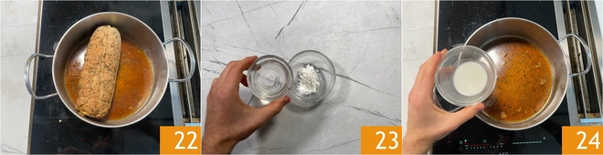 En fin de cuisson, le jus aura réduit mais restera encore liquide, la viande sera prête : transférez-la sur un plat en conservant le jus dans la casserole 22. Diluez la fécule de maïs dans l'eau froide 23, mélangez et versez dans la casserole 24.