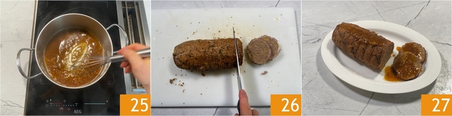 Faites cuire quelques instants en remuant avec un fouet jusqu'à ce que la sauce épaississe 25. À ce stade, vous pouvez trancher votre pain de viande 26 et le servir avec la sauce fraîchement préparée 27.