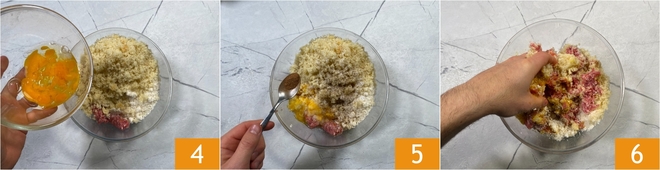 Ajoutez les œufs 4 et la muscade 5. Pétrissez à la main pendant quelques minutes 6, jusqu'à obtenir une préparation homogène.