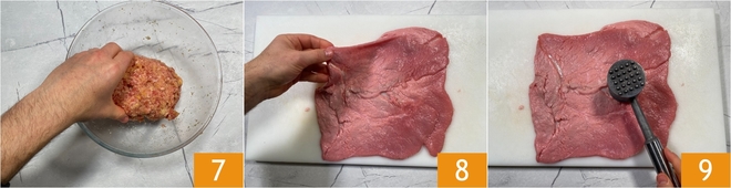 Façonnez la viande de manière à obtenir un cylindre 7. Disposez les tranches sur la planche en les faisant légèrement se chevaucher 8 puis aplatissez-les légèrement avec l'outil adapté, afin de former un carré 9.