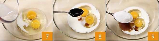 Passez maintenant à la réalisation du pain perdu : dans un bol, cassez les œufs et ajoutez le lait 7, l'extrait de vanille 8 et le sucre 9.