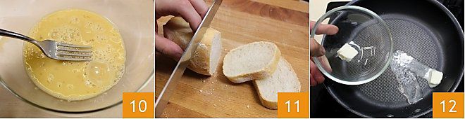 Battez le tout avec une fourchette pour bien mélanger les ingrédients 10. Coupez des tranches (pas trop grandes, si elles le sont, coupez-les en deux) de pain rassis 11 et faites fondre suffisamment de beurre pour couvrir le fond d'une poêle antiadhésive 12.