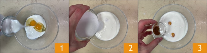 Pour préparer le pain perdu, commencez par casser les œufs dans un bol, puis ajoutez le lait de soja 1, le sucre 2 et la cannelle 3.