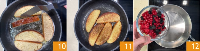Faites cuire, à feu moyen, pendant 1-2 minutes de chaque côté 10, jusqu'à ce qu'elles soient dorées 11 et réservez. Pendant que vous faites cuire toutes les tranches de pain brioché, préparez la sauce : dans une poêle, mettez les fruits rouges 12.