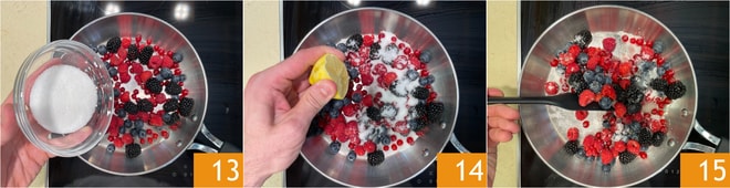 Ajoutez le sucre 13, le jus de citron 14 et faites cuire, à feu moyen, pendant 5-7 minutes 15.