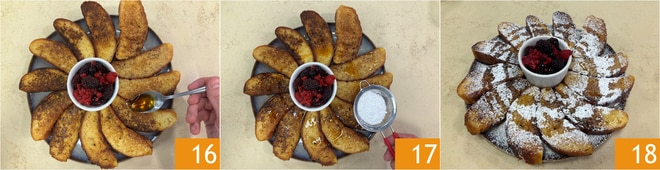 Pour le dressage, versez la sauce aux fruits rouges dans un petit bol, placez-le au centre du plat de service, puis disposez les tranches de pain brioché en étoile. Complétez avec du sirop d'érable 16 et du sucre glace 17. Votre pain perdu est prêt à être servi 18.