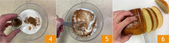 Ajoutez également l'extrait de vanille 4 et mélangez avec un fouet 5 pour bien amalgamer les ingrédients. Coupez le pain brioché en tranches assez épaisses, environ 2-3 cm 6. Vous devriez en obtenir 10.