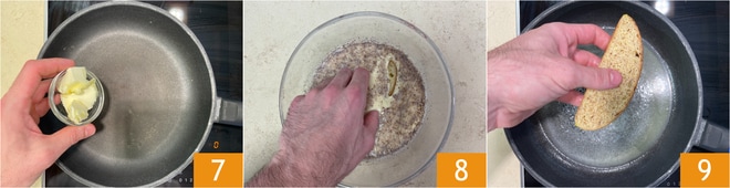 Dans une poêle antiadhésive, faites fondre le beurre 7, puis trempez les tranches de pain brioché dans le mélange de lait et d'œufs 8 et transférez-les dans la poêle chaude 9.
