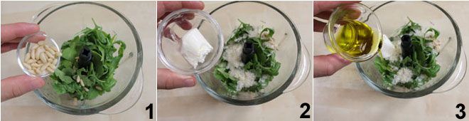 Pour préparer les petits pains plats avec tomates cerises farcies au fromage et roquette commencez par la crème de roquette : mettez la roquette bien lavée dans un mixeur avec les pignons 1, le parmesan et le fromage de chèvre 2 et l'huile d'olive 3.
