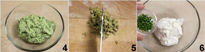 Activez les lames jusqu'à obtenir une crème lisse et bien homogène 4. Passez maintenant à la crème de fromage : hachez les olives 5 et la ciboulette. Dans un petit bol, mettez le fromage de chèvre, la ciboulette hachée 6,