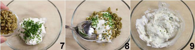 les olives vertes hachées 7, salez et poivrez et mélangez la crème avec l'aide d'une cuillère (8-9).