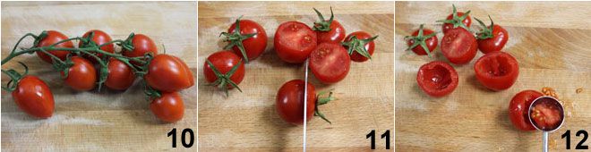 Détachez les tomates cerises de la grappe et lavez-les 10. Coupez la partie supérieure du pédoncule, en la gardant de côté car elle servira de décoration, et creusez l'intérieur à l'aide d'une cuillère parisienne 12.