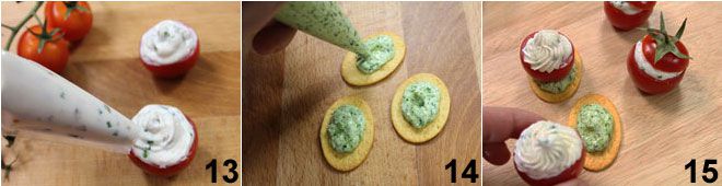 Transférez les crèmes dans deux poches à douille différentes et remplissez l'intérieur de chaque tomate cerise avec la crème de fromage 13 pendant que vous saupoudrez la surface des petits pains plats avec la crème de roquette 14. Placez sur chaque petit pain plat une tomate cerise couverte avec la partie coupée précédemment 15 et voilà vos petits pains plats avec tomates cerises farcies au fromage et roquette prêts!