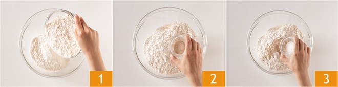 Pour préparer le wool roll bread, commencez par réaliser la pâte. Versez les deux farines dans un bol 1, ajoutez la levure sèche 2 et le sucre 3.