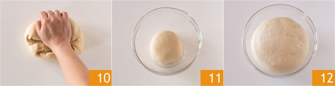 Lorsque vous aurez obtenu un mélange homogène, transférez la pâte sur un plan de travail et travaillez-la avec les mains 10 jusqu'à ce qu'elle soit lisse. Roulez la pâte en boule pour obtenir une forme sphérique et transférez-la dans un bol 11. Couvrez-la de film plastique et laissez-la lever dans un four éteint, uniquement avec la lumière allumée pendant environ 2 heures, jusqu'à ce que la pâte double de volume 12.
