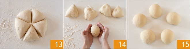Après le temps de repos de la pâte, transférez-la sur le plan de travail légèrement fariné et divisez-la en 5 morceaux égaux 13. Prenez une des petites boules et façonnez-la 14. Faites de même pour les 4 autres 15.