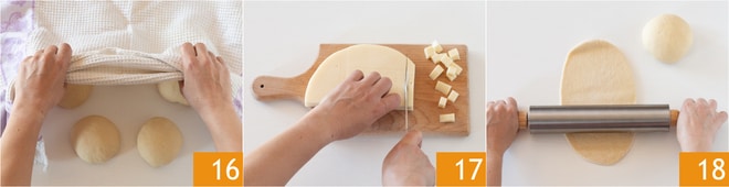 Couvrez-les avec un torchon 16 et laissez-les reposer encore 30 minutes. Pendant ce temps, coupez le provolone en dés 17. Étalez chaque boule avec un rouleau à pâtisserie pour obtenir un ovale 18.