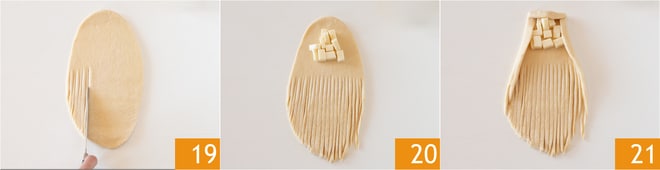 Maintenant, faites des incisions rapprochées avec un couteau ou une spatule, uniquement sur la moitié inférieure de l'ovale de pâte 19. Placez au centre de la partie supérieure des cubes de fromage 20 et refermez sur le fromage les extrémités latérales et celle du haut 21.