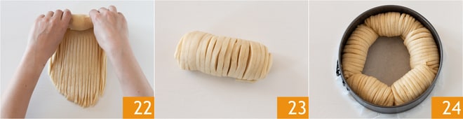 En partant du haut, roulez 22 jusqu'à obtenir un petit rouleau 23. Procédez de cette manière et placez-les au fur et à mesure dans un moule de 22 cm de diamètre et 6 cm de hauteur, tapissé de papier sulfurisé et préalablement huilé sur les bords. Disposez-les l'un à côté de l'autre de manière à recouvrir tout le périmètre du moule 24. Puis couvrez de film plastique.