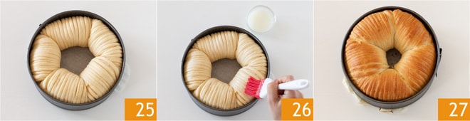 Laissez lever encore pendant une heure, dans un endroit tiède, jusqu'à ce qu'il atteigne la hauteur du moule 25. Badigeonnez la surface de la brioche avec du lait 26 et faites cuire dans un four préchauffé à 180°C pendant environ 35 à 40 minutes. Lorsqu'il est bien doré, sortez-le du four 27, attendez quelques minutes et servez-le.