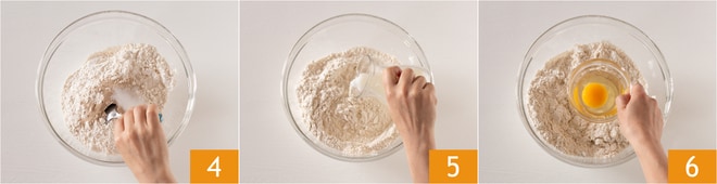 Mélangez avec une cuillère 4. Ajoutez le lait 5 et mélangez à nouveau. Versez ensuite l'œuf 6 et continuez à pétrir, vous verrez que le mélange commencera à prendre forme.