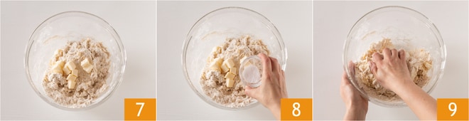 Incorporez le beurre mou 7 et le sel 8. Ensuite, travaillez bien la pâte avec les mains 9.