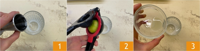 Pour préparer le cocktail Paloma, commencez par verser la tequila dans un tumbler haut 1. Notez qu'avec ces doses, vous obtiendrez 2 cocktails. Pressez le citron vert à l'aide d'un presse-agrumes, de manière à filtrer le jus 2 et versez-le dans le verre avec la tequila 3.