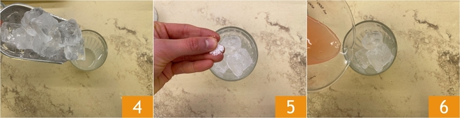 Ajoutez beaucoup de glace dans le tumbler 4, puis pour donner cette note salée typique, ajoutez une pincée de sel 5. Maintenant, versez la soda au pamplemousse dans le verre 6.