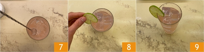 Avec la cuillère de bar, c'est-à-dire avec une cuillère à manche long et étroit, mélangez bien tous les ingrédients 7. Servez avec une tranche de citron vert sur le bord du tumbler 8 et votre cocktail rafraîchissant Paloma est prêt à être dégusté 9 !
