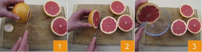 Pour préparer les pamplemousses farcis, commencez par laver les fruits, puis séchez-les et enlevez-en les deux extrémités 1, coupez-les en deux 2 et scarifiez la pulpe avec une lame bien aiguisée 3.