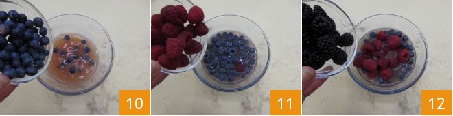 Entre-temps, nettoyez les fruits rouges et versez-les dans un récipient avec de l'eau, ainsi vous éviterez de devoir les rincer sous l'eau courante qui pourrait les abîmer ; une fois lavés, séchez les myrtilles et versez-les dans le jus de pamplemousse 10, faites de même avec les framboises 11 et les mûres 12,