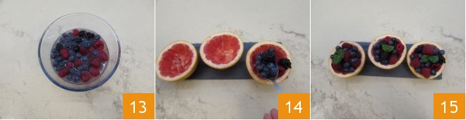 mélangez et couvrez de film alimentaire et laissez au réfrigérateur pendant 30 minutes 13. Une fois le temps écoulé, placez les coupelles sur un plat de service et au centre d'elles versez les fruits rouges 14, quand elles seront toutes bien remplies, arrosez avec le jus restant et garnissez avec quelques feuilles de menthe. Maintenant, vous aurez terminé la composition et vous pourrez servir les pamplemousses farcis immédiatement !