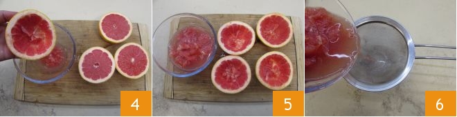 Videz le pamplemousse en faisant cependant très attention à ne pas détacher également la partie blanche du fruit, qui est très amère, et recueillez pulpe et jus dans un récipient 4 en répétant l'opération pour toutes les autres moitiés 5, de cette manière vous obtiendrez 4 coupelles. Couvrez les pamplemousses vidés de film alimentaire et réservez-les au réfrigérateur. Puis placez une passoire dans un récipient et versez la pulpe et le jus du pamplemousse 6,