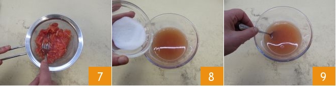 écrasez le fruit en vous aidant d'une fourchette, ainsi vous obtiendrez le jus bien filtré des déchets de la pulpe 7. Dans le récipient avec le jus, versez le sucre 8 et mélangez bien 9.