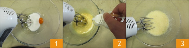Pour préparer les pancakes à l'avoine, commencez par travailler l'œuf avec le sucre à l'aide d'un batteur électrique 1. Une fois obtenu un mélange mousseux, versez le lait en filet 2 et fouettez jusqu'à ce qu'il soit incorporé 3.