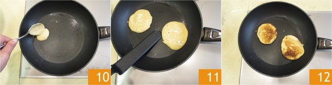 Lorsque la poêle est chaude, versez une ou deux cuillères de pâte et donnez-lui la forme des pancakes 10. Cuisez pendant 3-4 minutes, puis retournez-les délicatement 11 et laissez cuire encore 2-3 minutes jusqu'à ce qu'ils soient dorés 12.