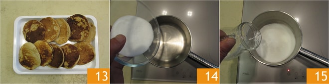 Mettez de côté les pancakes 13 et préparez le caramel. Versez le sucre dans une petite casserole à fond épais 14 et ajoutez environ 50 g d'eau 15.