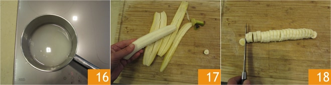 Portez à ébullition à feu doux 16 jusqu'à ce qu'il prenne une couleur ambrée. Pendant ce temps, épluchez les bananes 17 et coupez-les en rondelles d'environ 1 cm d'épaisseur 18.