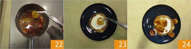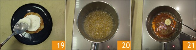 Disposez les pancakes dans une assiette et garnissez de mascarpone 19. Lorsque le caramel a pris couleur 20, éteignez le feu et plongez les bananes 21.