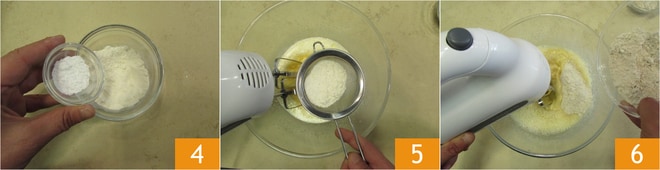 Mélangez la farine 00 avec la levure 4 et incorporez-la dans le mélange en tamisant les poudres à travers un tamis 5, puis ajoutez également la farine d'avoine et travaillez la pâte 6.