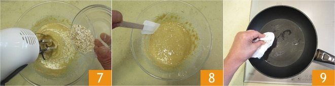 Ajoutez enfin les flocons d'avoine 7. La pâte est prête à être cuite 8. Chauffez la poêle et graissez-la avec un peu de beurre 9.