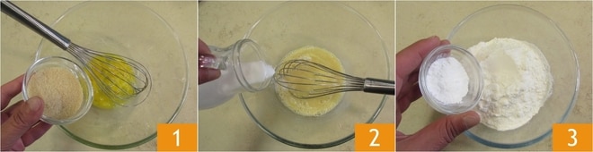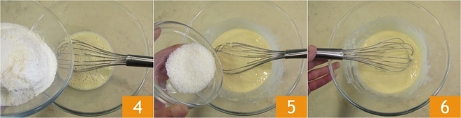 Pour préparer les pancakes à la noix de coco, commencez par verser les œufs dans un bol avec le sucre de canne 1 et travaillez à l'aide d'un fouet. Ajoutez le lait de coco 2 et mélangez à nouveau. Dans un autre bol, mélangez la farine et la levure 3.